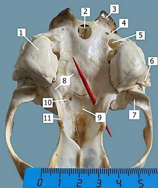 9 – presphenoid; 10 – opening of the pterygoid canal; 11 – pterygoid bone