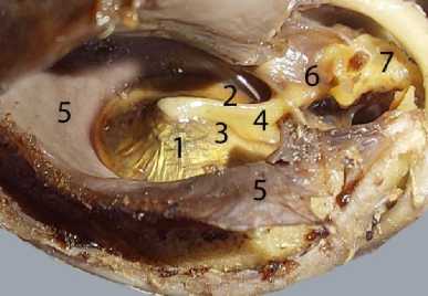 Baikal seal hammer handle at the age of 4 years: 1 – eardrum; 2 – handle; 3 – drum strip; 4 – lateral process; 5 – mucous membrane; 6 – cervix; 7 – anvil