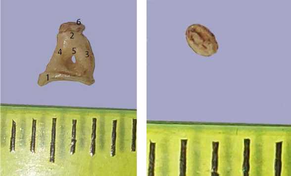 Рис. 12. Стремечко (А) с чечевицеобразной косточкой (Б) байкальской нерпы в возрасте 7 лет: 1 – основание; 2 – головка; 3 – ростральная ножка; 4 – каудальная ножка; 5 – отверстие между ножками; 6 – чечевицеобразнаая косточка