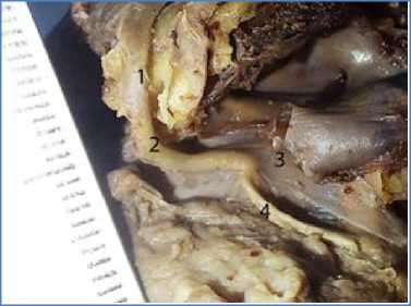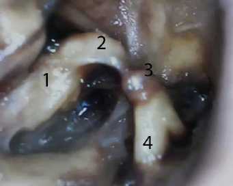 Рис. 13. Слуховые косточки байкальской нерпы в возрасте 7 лет (фото с отоскопа): 1 – наковальня; 2 – длинный отросток; 3 – чечевицеобразнаая косточка; 4 – стремечко Auditory ossicles of the Baikal seal at the age of 7 years (photo from the otoscope): 1 – anvil;
