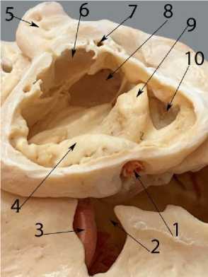 7 – суставной бугорок чешуи височной кости; 8 – базисфеноид; 9 – пресфеноид; 10 – отверстие крылового канала; 11 – крыловидная кость