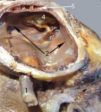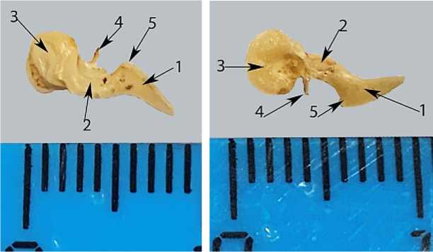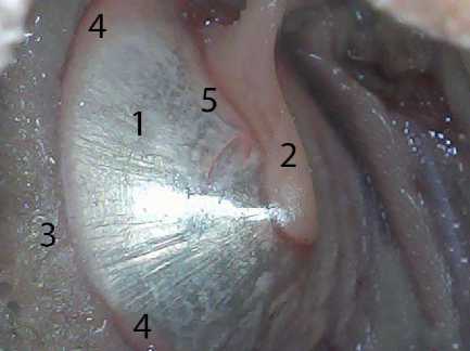 Рис. 10. Рукоятка молоточка байкальской нерпы в возрасте 4 лет: 1 – барабанная перепонка; 2 – рукоятка; 3 – барабанная полоска; 4 – латеральный отросток; 5 – слизистая оболочка;
