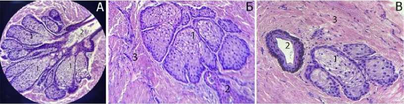 Рис. 14. Топография лицевого нерва байкальской нерпы в возрасте 3 недель: А – в лицевом канале и барабанной полости: 1 – лицевой нерв в канале; 2 – изгиб; 3 – слизистая оболочка;