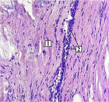 Слизистая оболочка, выстилающая костный рельеф, состоит из однослойного многорядного мерцательного эпителия, собственной пластинки, представленной волокнами и фибробластами, подслизистой основы из плотной неоформленной соединительной ткани. Отмечено, что в подслизистой основе в области, прилегающей к барабанной перепонке, было обнаружено большое количество разветвленных альвеолярных желез с пигментированными выводными протоками, имеющих голокриновый тип секреции. Эти железы, по нашему мнению, защищают среднее ухо от воды и патогенных микроорганизмов. Большая часть слизистой оболочки представлена однослойным кубическим эпителием, она же и покрывает слуховые косточки, при этом в подслизистой основе исчезают железы.