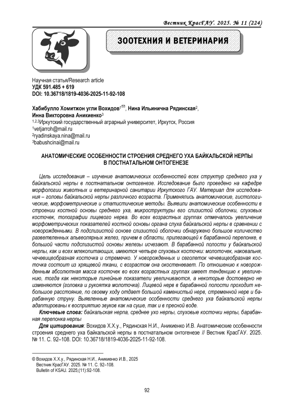 IDR: 140313045 | УДК: 591.485 + 619 | DOI: 10.36718/1819-4036-2025-11-92-108