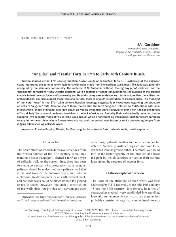 Written sources of the 17th century mention “kosoi” (angular or slanted) forts. F.F. Laskovsky of the Engineer Corps interpreted this term as referring to forts with walls made from inclined logs (palisades). This idea was generally accepted by the scholarly community. The architect S.N. Balandin, without offering any proof, claimed that the “kozelchaty” forts (from “kozly”, trestle supports) were a subtype of “kosoi” (angular) forts. The purpose of the present study is to test the conclusions of Laskovsky and Balandin using new evidence. As it turns out, neither the written nor archaeological sources support these versions. In fact, there is enough information to disprove both. The meaning of the word “kosoi” in the 17th–19th century Russian language suggests four hypotheses regarding the structure of walls of “angular” forts. Comparison of them reveals that the term “angular” referred to fortifications with nonstraight walls, those joining not at a right angle, as well as those that were triangular in plan view. The specific layout of “kozelchaty” forts cannot be determined due to the lack of evidence. Probably their walls actually rested on trestle supports—two supports made of two or three logs each, on which a horizontal log was placed. Such forts were common mostly in northeast Asia, where forests were scarce, and the ground was frozen or rocky, preventing people from digging ditches for log palisade walls.