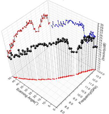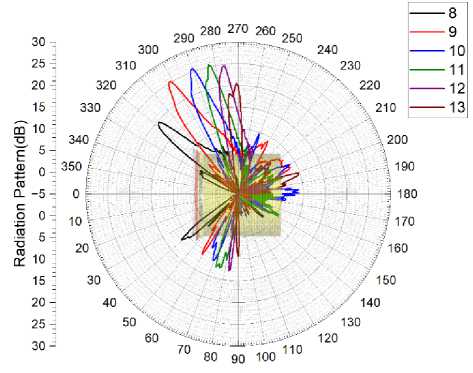 Гибридное частотно-электронное сканирование луча в разработанной антенной системе предлагается реализовать следующим образом: частотное сканирование луча производить по угломестной плоскости, а электронное сканирование луча производить по азимутальной плоскости посредством коммутационного переключения портов диаграммообразующего устройства. С учетом этого было проведено компьютерное моделирование разработанной антенной системы с целью определения ее характеристик. Величина проекта соответствовала 1,5 млрд расчетных точек. Это потребовало довольно продолжительного времени для расчета проекта (более 500 часов). В предполагаемой полосе частот функционирования системы от 8 ГГц до 13 ГГц коэффициент стоячей волны по напряжению соответствовал величине от 1,5 до 3. Это вызвано потерями в системе диаграммообразования на высоких частотах. Чтобы снизить уровень данных потерь предполага- ется возможность применения активной системы на малошумящих усилителях. В результате компьютерного моделирования были получены диаграммы направленности разработанной антенной системы, они представлены на рисунке 4.