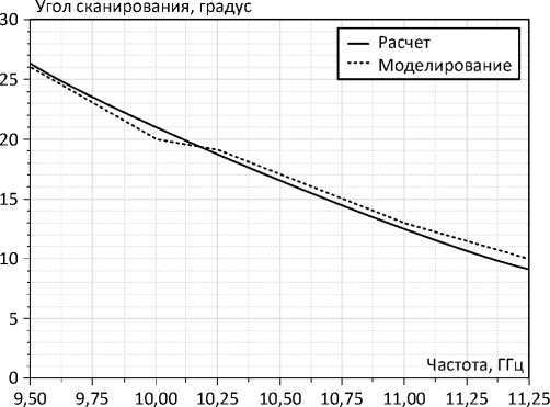 Рисунок 6. Зависимость угла сканирования от частоты: расчет и моделирование