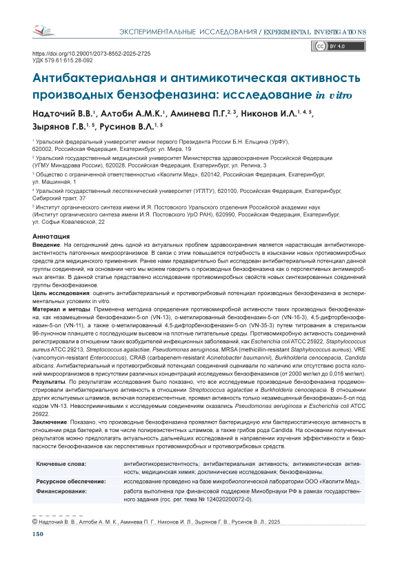 Введение. На сегодняшний день одной из актуальных проблем здравоохранения является нарастающая антибиотикорезистентность патогенных микроорганизмов. В связи с этим повышается потребность в изыскании новых противомикробных средств для медицинского применения. Ранее нами предварительно был исследован антибактериальный потенциал данной группы соединений, на основании чего мы можем говорить о производных бензофеназина как о перспективных антимикробных агентах. В данной статье представлено исследование противомикробных свойств новых синтезированных соединений группы бензофеназинов. Цель исследования: оценить антибактериальный и противогрибковый потенциал производных бензофеназина в экспериментальных условиях in vitro. Материал и методы. Применена методика определения противомикробной активности таких производных бензофеназина, как незамещенный бензофеназин-5-ол (VN-13), о-метилированный бензофеназин-5-ол (VN-16-3), 4,5-дифторбензофеназин-5-ол (VN-11), а также о-метилированный 4,5-дифторбензофеназин-5-ол (VN-35-3) путем титрования в стерильном 96-луночном планшете с последующим высевом на плотные питательные среды. Противомикробную активность соединений регистрировали в отношении таких возбудителей инфекционных заболеваний, как Escherichia coli ATCC 25922, Staphylococcus aureus ATCC 29213, Streptococcus agalactiae, Pseudomonas aeruginosa, MRSA (methicillin-resistant Staphylococcus aureus), VRE (vancomycin-resistant Enterococcus), CRAB (carbapenem-resistant Acinetobacter baumannii), Burkholderia cenocepacia, Candida albicans. Антибактериальный и противогрибковый потенциал соединений оценивали по наличию или отсутствию роста колоний микроорганизмов в присутствии различных концентраций исследуемых бензофеназинов (от 2000 мкг/мл до 0,016 мкг/мл). Результаты. По результатам исследования было показано, что все исследуемые производные бензофеназина продемонстрировали антибактериальную активность в отношении Streptococcus agalactiae и Burkholderia cenocepacia. В отношении других испытуемых штаммов, включая полирезистентные, проявил активность только незамещенный бензофеназин-5-ол под кодом VN-13. Невосприимчивыми к исследуемым соединениям оказались Pseudomonas aeruginosa и Escherichia coli ATCC 25922. Заключение. Показано, что производные бензофеназина проявляют бактерицидную или бактериостатическую активность в отношении ряда бактерий, в том числе полирезистентных штаммов, а также грибов рода Candida. На основании полученных результатов можно предполагать актуальность дальнейших исследований в направлении изучения эффективности и безопасности бензофеназинов как перспективных противомикробных и противогрибковых средств.