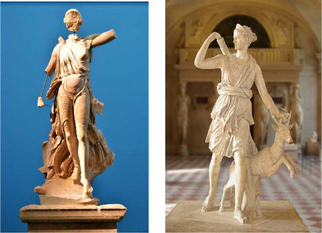 Рис. 1. Слева направо: Кариатиды, оригинал. 420–406 гг. до н. э. Храм Эрехтейон. Афинский акрополь; Поэний. «Ника», оригинал. Ок. 240 г. до н.э. Археологический музей. Олимпия. Греция; Леохар. «Диана Версальская», римская копия. Ок. 350 г. до н.э. Лувр. Париж