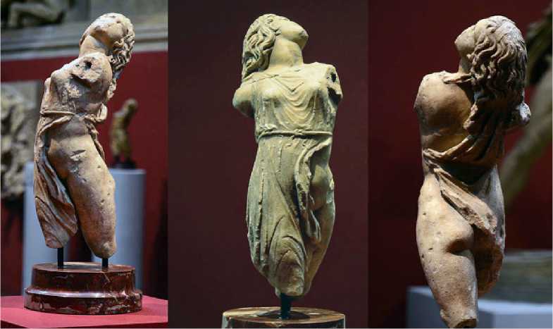 Fig. 1. Left to right: Caryatids, original. 420–406 BC. Erechtheum Temple. Acropolis of Athens; Poenius. Nike, original. ca. 240 BC. Archaeological Museum, Olympia, Greece; Leochares. Diana of Versailles, Roman copy. ca. 350 BC. Louvre, Paris линию как основной пластический мотив: «Существуют документы, в которых две красоты запечатлены в совершенном состоянии - идеальная красота человеческой формы и идеальная красота движения; это собранные в музеях древнегреческие вазы. Среди тысяч и тысяч фигур, которые я изучала на этих вазах, я всегда находила волнистую линию в качестве отправной точки. Каждое движение, даже в состоянии покоя, содержит в себе качество плодородия, обладает силой породить другое движение»1. [12, с. 90-91]. Танцовщицу-новатора привлекали как отдельные произведения, так и запечатленные в изобразительных источниках фрагменты античного танца, в которых она видела непревзойденные образцы пластики движения и бесконечное разнообразие вариаций хитона (Рис. 1).