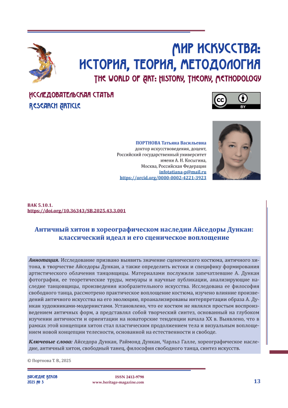 Исследование призвано выявить значение сценического костюма, античного хитона, в творчестве Айседоры Дункан, а также определить истоки и специфику формирования артистического облачения танцовщицы. Материалами послужили запечатлевшие А. Дункан фотографии, ее теоретические труды, мемуары и научные публикации, анализирующие наследие танцовщицы, произведения изобразительного искусства. Исследована ее философия свободного танца, рассмотрено практическое воплощение костюма, изучено влияние произведений античного искусства на его эволюцию, проанализированы интерпретации образа А. Дункан художниками-модернистами. Установлено, что ее костюм не являлся простым воспроизведением античных форм, а представлял собой творческий синтез, основанный на глубоком изучении античности и ориентации на новаторские тенденции начала XX в. Выявлено, что в рамках этой концепции хитон стал пластическим продолжением тела и визуальным воплощением новой концепции телесности, основанной на естественности и свободе.