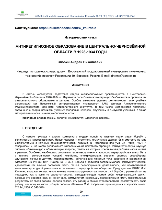Антирелигиозное образование в Центрально-Чернозёмной области в 1928-1934 годы