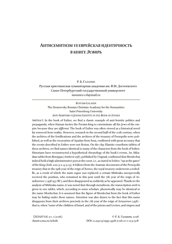 В книге Есфирь мы находим классический пример антисемитской политики и пропаганды, когда Аман подстрекает персидского царя к истреблению всех евреев империи за то, что они отличаются от других. Книга Есфирь часто рассматривалась как исторический роман, далекий от реальности. Однако исследования второй половины XX века, когда были опубликованы архивы укреплений и сокровищницы Персеполя, а также раскопки Ападана в Сузе, с большой точностью подтвердили, что события, описанные в Есфири, не являются вымыслом. На глиняных эламских клинописных табличках из этих архивов мы находим имена, идентичные многим персонажам книги Есфирь. Историки реконструировали гипотетическую хронологию событий книги. Аккадская табличка из Борсиппы (Амхерст, 258 г. до н.э.), опубликованная Унгнадом, подтверждает, что Мордехай действительно занимал высокий административный пост при дворе, то есть, как сказано в книге Есфирь, «сидел у ворот» царя (Есфирь 2:21; 3:2-4; 5:13). Из арамейских документов из сокровищницы Персеполя следует, что на 19-м году правления Ксеркса в царской казне произошла перестановка, в результате которой главный сеган был заменен: неожиданно эту должность получил некий Митрака, который оставался на этом посту до 7-го года правления Артарксеркса I (458/457 г. до н.э.), а затем исчез так же внезапно, как и появился. Благодаря анализу имени Митрака было отмечено, что посредством метатезиса в одной табличке приводится транскрипция mrtk, которая, по мнению некоторых ученых, фонетически может быть идентична имени Мордехай. Предполагается, что под этими именами может скрываться образ Мордехая из книги Есфири. Также было обращено внимание на то, что это имя исчезает из их архивов именно на 7-м году правления Артаксеркса (458 г.) — то есть, когда «некоторые из сынов Израилевых, и священников, и левитов, и певцов, и привратников, и нефийцев пошли в Иерусалим на седьмом году царствования Артаксеркса» (Ездра 7:7). Также на 19-м году правления Ксеркса, когда Митрака/Мордехай был назначен сеганом, и в обращение была введена новая царская печать «Ксеркс, Великий Царь», использование которой, однако, прекратилось в год исчезновения Мордехая – на 7-м году правления Артаксеркса. Возможно, на 19-м году его правления «царь снял свой перстень, который он взял у Амана, и отдал его Мордехаю» (Есфирь 8:2). Наша статья посвящена реконструкции этого исторического контекста.