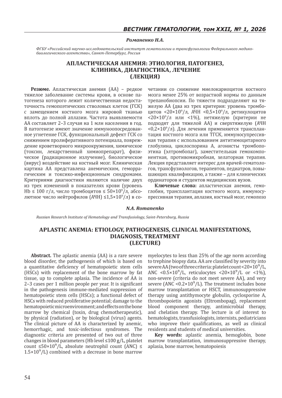 Апластическая анемия (АА) – редкое тяжелое заболевание системы крови, в основе патогенеза которого лежит количественная недостаточность гемопоэтических стволовых клеток (ГСК) с замещением костного мозга жировой тканью вплоть до полной аплазии. Частота выявляемости АА составляет 2–3 случая на 1 млн населения в год. В патогенезе имеют значение иммуноопосредованное угнетение ГСК, функциональный дефект ГСК со снижением пролиферативного потенциала, повреждение кроветворного микроокружения, химическое (токсин, лекарственный химиопрепарат), физическое (радиационное излучение), биологическое (вирус) воздействие на костный мозг. Клиническая картина АА представлена анемическим, геморрагическим и токсико-инфекционным синдромами. Критериями диагностики являются наличие двух из трех изменений в показателях крови (уровень Hb ≤ 100 г/л, число тромбоцитов ≤ 50×109/л, абсолютное число нейтрофилов (АЧН) ≤1,5×109/л) в сочетании со снижение миелокариоцитов костного мозга менее 25% от возрастной нормы по данным трепанобиопсии. По тяжести подразделяют на тяжелую АА (два из трех критерия: уровень тромбоцитов <20×109/л, АЧН <0,5×109/л, ретикулоцитов <20×109/л или <1%), нетяжелую (критерии не подходят для тяжелой АА) и сверхтяжелую (АЧН <0,2×109/л). Для лечения применяются трансплантация костного мозга или ТГСК, иммуносупрессивная терапия с использованием антитимоцитарного глобулина, циклоспорина А, агонисты тромбопоэтина (элтромбопаг), заместительная гемокомпонентная, противомикробная, хелаторная терапия. Лекция представляет интерес для врачей-гематологов, трансфузиологов, терапевтов, педиатров, повышающих квалификацию, а также – для клинических ординаторов и студентов медицинских вузов.