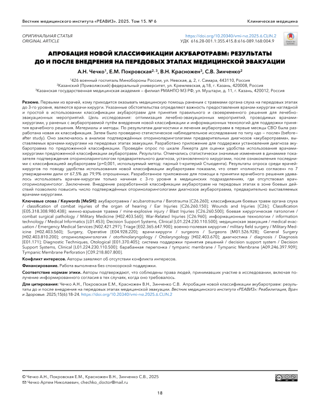 Первыми из врачей, кому приходится оказывать медицинскую помощь раненым с травмами органа слуха на передовых этапах до 3-го уровня, являются врачи-хирурги. Указанные обстоятельства определяют важность предоставления врачам-хирургам наглядной и простой в использовании классификации акубаротравм для принятия правильного и своевременного решения для лечебноэвакуационных мероприятий. Цель исследования: оптимизация лечебно-эвакуационных мероприятий, проводимых врачамихирургами, у раненых с акубаротравмой путём внедрения новой классификации и информационных технологий для поддержки принятия врачебного решения. Материалы и методы. По результатам диагностики и лечения акубаротравм в первые месяцы СВО была разработана новая их классификация. Затем было проведено статистическое наблюдательное исследование по типу «до — после» (before— after study). Оно заключалось в анализе подтверждённых оториноларинголагами предварительных диагнозов «акубаротравма», выставляемых врачами-хирургами на передовых этапах эвакуации. Разработано приложение для поддержки установления диагноза акубаротравма по предложенной классификации. Проведён опрос по шкале Ликерта для оценки удобства использования врачамихирургами предложенной классификации акубаротравм. Результаты. Отмечались статистически значимые изменения в динамике показателя подтверждения оториноларингологом предварительного диагноза, установленного хирургами, после ознакомления последними с классификацией акубаротравм (p=0,001, используемый метод: парный t–критерий Стьюдента). Результаты опроса среди врачейхирургов по поводу удобства использования новой классификации акубаротравм показали, что ответ «полностью согласен» по 7 утверждениям дали от 67,5% до 79,9% опрошенных. Разработанное приложение для помощи в принятии врачебного решения удавалось использовать врачам-хирургам только начиная с 3-го уровня в медицинских подразделениях, где отсутствовал врачоториноларинголог. Заключение. Внедрение разработанной классификации акубаротравм на передовых этапах в зоне боевых действий позволило повысить число подтверждённых оториноларингологами диагнозов акубаротравма, предварительно выставляемых врачами-хирургами.
