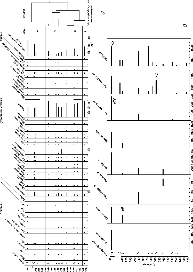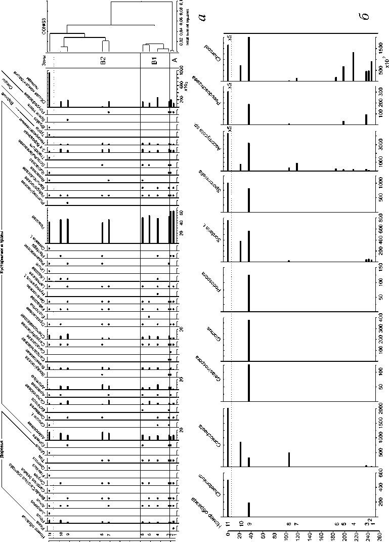 Рис. 2. Результаты спорово-пыльцевого анализа в кургане Туак-Оба 1 а – спорово-пыльцевая диаграмма; б – диаграмма непыльцевых палиноморф внидЛщ