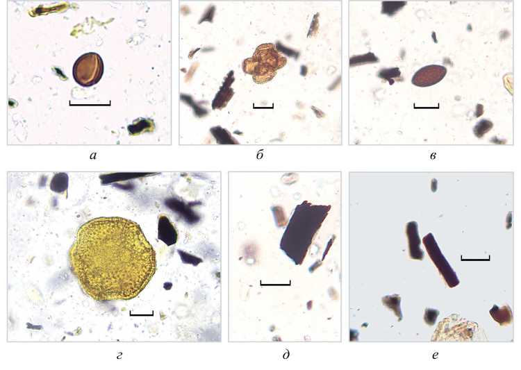 Рис. 4. Микрофотографии пыльцы и непыльцевых палиноморф а – Coniochaeta; б – комок пыльцы Brassicaceae; в – Gelasinospora; г – Dipsacaceae; д, е – микроугли, морфотип В1. Масштабный отрезок 15 мкм разновременных слоев насыпи. Хорошим индикатором присутствия ПП является высокая концентрация пыльцы (Dimbleby, 1985. С. 71–88). Однако следует учитывать случаи, когда верхние сантиметры ПП могут изыматься или нарушаться при подготовке места погребения или сооружении конструкций.