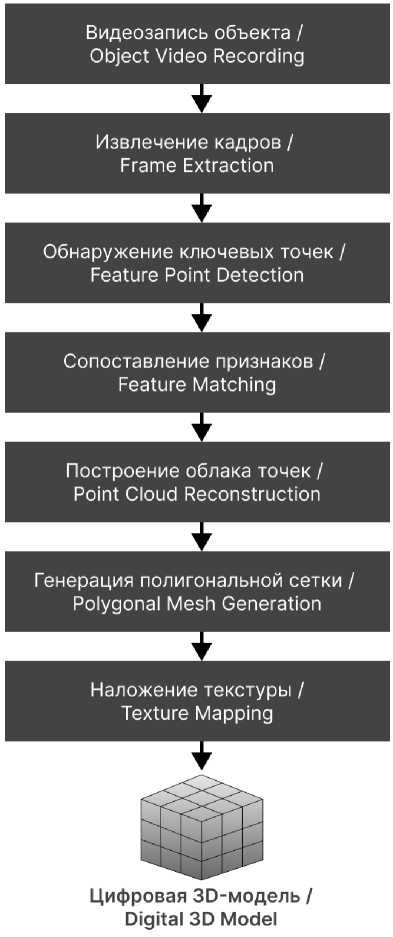 Процесс преобразования видеоизображения в цифровую 3D-модель включает несколько последовательных этапов. На первом этапе выполняется извлечение кадров, при котором видеозапись разделяется на набор отдельных изображений. Затем осуществляется обнаружение ключевых точек, когда алгоритмы компьютерного зрения определяют характерные элементы изображения. Далее выполняется сопоставление признаков, позволяющее находить совпадающие точки на различных изображениях. На основе полученных данных выполняется построение облака точек, формирующего пространственную структуру объекта. После этого создаётся полигональная сетка, представляющая геометрическую поверхность объекта. Заключительным этапом является наложение текстуры, обеспечивающее реалистичную визуализацию модели [3].