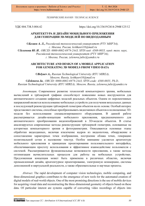 Современные цифровые технологии активно внедряются в процессы создания и визуализации 3D объектов. В последние годы наблюдается значительный рост интереса к методам автоматического построения 3D-моделей на основе изображений и видеоданных. Подобные технологии находят применение в различных областях, включая промышленный дизайн, архитектурное проектирование, электронную коммерцию, игровую индустрию и системы дополненной реальности. Традиционные методы создания 3D-моделей требуют использования специализированного программного обеспечения и значительных навыков в области 3D-моделирования. В то же время развитие алгоритмов компьютерного зрения позволяет существенно автоматизировать данный процесс. Одним из перспективных направлений является разработка мобильных приложений, способных формировать трёхмерные модели объектов на основе видеозаписи, выполненной камерой смартфона. Использование мобильных устройств делает технологию доступной для широкого круга пользователей и упрощает процесс сбора исходных данных. Целью данной работы является разработка концепции мобильного приложения для преобразования видеоизображений в 3D-модели объектов, а также определение основных принципов проектирования интерфейса и архитектуры системы. Процесс преобразования видеоизображения в 3D-модель включает несколько последовательных этапов обработки данных. Общая схема данного процесса представлена на Рисунке. В основе автоматического построения цифровых 3D-моделей лежат методы компьютерного зрения и фотограмметрии. Основная задача заключается в восстановлении геометрической структуры объекта на основе набора изображений, полученных с различных ракурсов. Наиболее распространёнными методами являются Structure from Motion (SfM), позволяющий восстанавливать пространственную структуру сцены и параметры камеры на основе анализа последовательности изображений, и Multi-View Stereo (MVS), применяемый для построения плотного облака точек по множеству изображений. Также используются алгоритмы оценки глубины изображения и нейросетевые методы реконструкции трёхмерных сцен. Несмотря на активное развитие данных технологий, большинство существующих решений реализовано в виде настольных программ или облачных сервисов. Мобильные приложения для автоматической реконструкции 3D-моделей находятся на стадии активного развития [1-3].