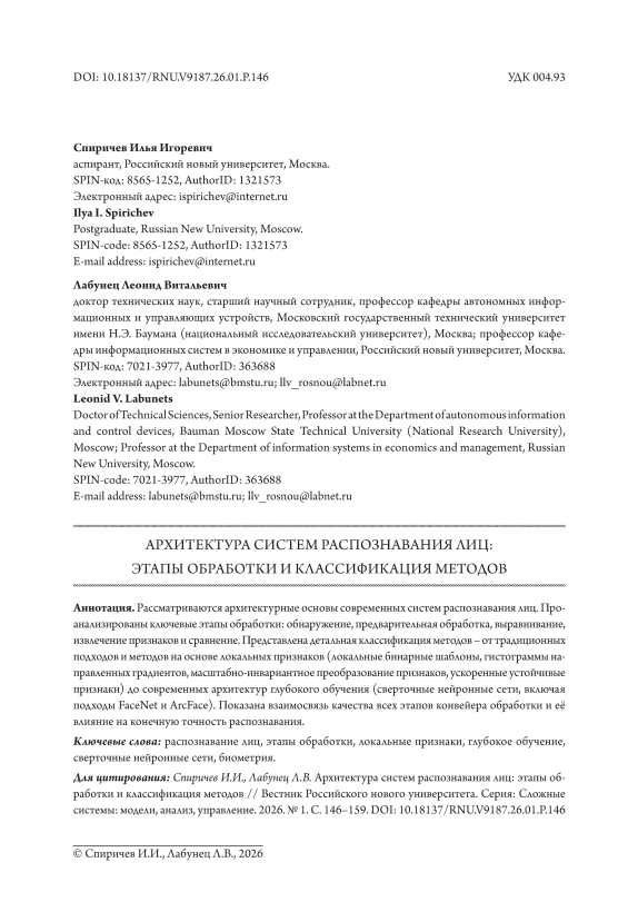 Рассматриваются архитектурные основы современных систем распознавания лиц. Проанализированы ключевые этапы обработки: обнаружение, предварительная обработка, выравнивание, извлечение признаков и сравнение. Представлена детальная классификация методов – от традиционных подходов и методов на основе локальных признаков (локальные бинарные шаблоны, гистограммы направленных градиентов, масштабно-инвариантное преобразование признаков, ускоренные устойчивые признаки) до современных архитектур глубокого обучения (сверточные нейронные сети, включая подходы FaceNet и ArcFace). Показана взаимосвязь качества всех этапов конвейера обработки и её влияние на конечную точность распознавания.