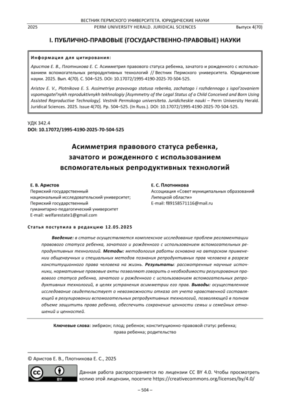 Abstract: this article provides a comprehensive research into the problems related to regulating the legal status of a child conceived and born using assisted reproductive technology (ART). Methods: methodologically, the research is based on the authors’ application of general scientific and special methods of cognition to study reproductive rights of a person through the prism of the constitutional right to life. Results: analysis of scientific sources and regulatory legal acts reveals the need for the legal status of a baby conceived and born with the use of ART to be regulated so as to eliminate the asymmetry of his rights. Conclusions: the emphasis on the moral component in the regulation of ART makes it possible to better protect the rights of a child and ensure the preservation of the value of family and family relations.