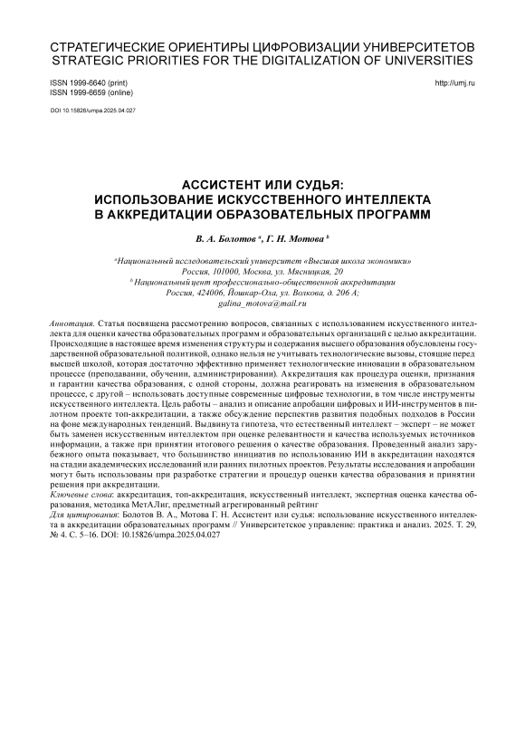 Текст научной статьи Ассистент или судья: использование искусственного интеллекта в аккредитации образовательных программ