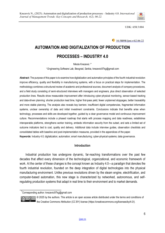 The purpose of this paper is to examine how digitalization and automation principles of the fourth industrial revolution improve efficiency, quality and flexibility in manufacturing systems, with a focus on practical steps for implementation. The methodology combines a structured review of academic and professional sources, document analysis of company procedures, and a field study consisting of semi-structured interviews with managers and engineers, plus direct observation of selected production lines. Results show measurable improvement after introducing cyber-physical monitoring, sensor-based tracking and data-driven planning: shorter production lead time, higher first-pass yield, fewer unplanned stoppages, better traceability and more stable planning. The analysis also reveals key barriers: insufficient digital competencies, fragmented information systems, unclear ownership of data and initial investment constraints. Conclusions indicate that benefits arise when technology, processes and skills are developed together, guided by a clear governance model and continuous improvement culture. Recommendations include a phased roadmap that starts with process mapping and data readiness, establishes interoperable platforms, strengthens worker training, embeds information security from the outset, and sets a limited set of outcome indicators tied to cost, quality and delivery. Additional data include interview guides, observation checklists and consolidated tables with baseline and post-implementation measures, provided in the appendices of the paper