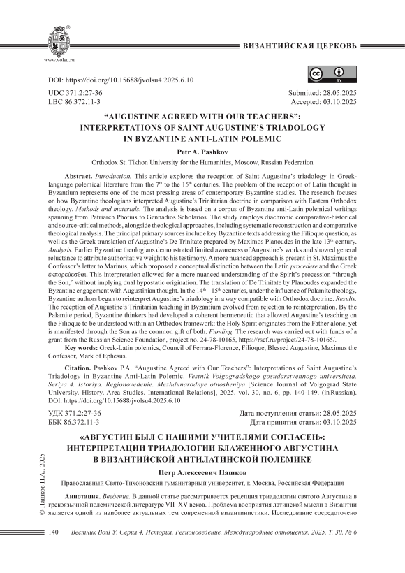 Введение. В данной статье рассматривается рецепция триадологии святого Августина в грекоязычной полемической литературе VII–XV веков. Проблема восприятия латинской мысли в Византии является одной из наиболее актуальных тем современной византинистики. Исследование сосредоточено на том, как византийские богословы истолковывали триадологическое учение Августина в сопоставлении с восточнохристианским богословием. Методы и материалы. Анализ основан на корпусе византийских антилатинских полемических сочинений от св. патриарха Фотия до Геннадия Схолария. В исследовании применяются диахронный сравнительно-исторический и источниковедческий методы, а также методы теологические, включающие систематическую реконструкцию и сравнительно-богословский анализ. В число основных источников входят ключевые византийские тексты, посвящённые вопросу Filioque, а также греческий перевод трактата Августина De Trinitate, выполненный Максимом Планудом в конце XIII века. Анализ. Ранние византийские богословы имели ограниченное представление о сочинениях Августина и, как правило, не придавали его свидетельствам авторитетного значения. Более дифференцированный подход наблюдается в послании святого Максима Исповедника к Марину, где предлагается концептуальное различие между латинским procedere и греческим ἐκπορεύεσθαι. Это толкование позволило по-новому понять «исхождение» Духа «через Сына» – в смысле, не подразумевающем двойного ипостасного происхождения. Перевод De Trinitate, выполненный Планудом, значительно расширил представление византийцев об учении св. Августина. В XIV–XV вв. под влиянием паламитского богословия византийские авторы начали реинтерпретировать триадологию Августина в духе православного вероучения. Результаты. Рецепция триадологического учения Августина в Византии прошла путь от неприятия к богословскому переосмыслению. Опираясь на паламитский богословский синтез, византийские мыслители выработали целостную герменевтику, позволявшую истолковать учение Августина о Filioque в православных категориях: Святой Дух исходит от одного только Отца, но является миру через Сына как общий дар Отца и Сына. Финансирование. Исследование выполнено за счет гранта Российского научного фонда № 24-78-10165, https://rscf.ru/project/24-78-10165/.