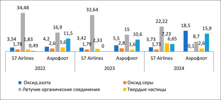 Сравнение итогов деятельности показывает существенное превышение рейсов, пассажиропотока и выручки у «Аэрофлота». Однако коэффициент занятости кресел выше у «S7 Airlines», что говорит о более рациональном использовании ресурсов авиакомпанией и снижении вреда экологи- ческому окружению. Сравнивая в динамике выбросы парниковых газов и значимых загрязняющих веществ видно, что ежегодные выбросы парниковых газов «Аэрофлота» превышают аналогичные показатели «S7 Airlines». Также потребление энергии у авиакомпании «Аэрофлот» значительнее, чем у ее конкурента. Динамика образования и утилизации отходов демонстрирует более ответственный подход «S7 Airlines», которая утилизирует 100 % из них. «Аэрофлот» же ежегодно снижает объемы утилизации. Анализ данных о водопотреблении и водосбросе авиакомпаний позволил сделать вывод о более эффективном использовании воды «S7 Airlines», чем ее конкурентом.