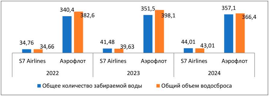 Анализируя представленные данные о водопотреблении и водосбросе авиакомпаний «S7 Airlines» и «Аэрофлот» за 20222024 годы, можно констатировать устойчивый рост водопотребления и водосброса у первой авиакомпании, 27 % и 5 % соответственно. «Аэрофлот» незначительно увеличил потребление воды на 4,9 %, и снизил водосброс на 4,2 %. Таким образом, можно сделать вывод о более эффективном исполь- зовании воды «S7 Airlines», чем ее конкурентом. Если разница между водопотреблением и водосбросом у «S7 Airlines» составляет 2,5 тыс. м3,то у «Аэрофлота» - 9,1 тыс. м3.