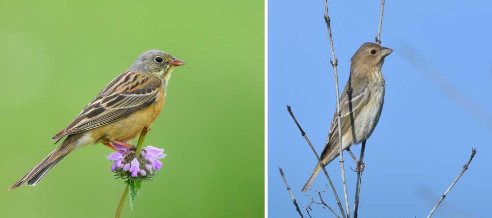 Рис. 2. Характерные виды летней авифауны разнотравно-злаковых степей южного склона Сунженского хребта: садовая овсянка Emberiza hortulana и просянка Miliaria calandra . Фото Д.С.Шевцова