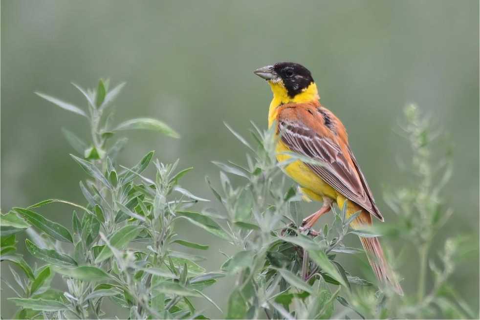 Рис. 4. Характерные виды летней авифауны разнотравно-злаковых степей южного склона Сунженского хребта: черноголовая овсянка Granativora melanocephala . Фото Д.С.Шевцова