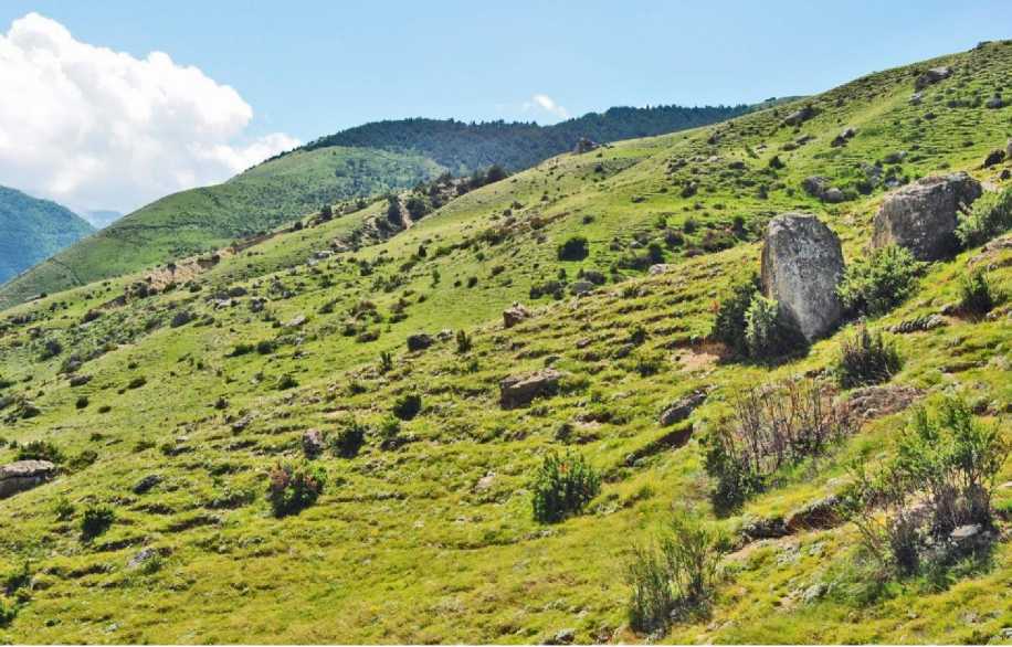 Горностепная зона (рис. 5) занимает межгорные котловины между Скалистым и Боковым хребтами и в республике зона чётко прослеживается через все межгорные котловины Северо-Юрской депрессии. Здесь выделяют небольшие по площади горные луговые степи, нагорные ксерофиты и горные злаково-разнотравные степи (Амирханов 1978), занимающие наибольшие площади на южных склонах Скалистого хребта. Задернение горных степей составляет 0.8. В их состав входит также несколько растительных сообществ: антропогенные (бородачевые), ковыльно-разнотравные и ковыльно-волосатиковые степи, в которых травяной покров состоит из Bothriochloa ischaemum , Stipa capillata, Stipapulcher-rima, Stipa daghestanica , Salvia canescens , Ranunculus oreophilus . Из кустарников обычны Astragalus denudatus , Juniperus sabina , Berberis vulgaris , Rosa canina , по балкам встречаются кусты Hippophaё rhamnoides и деревца Ulmus suberosa .
