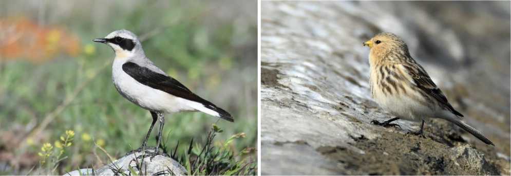 Рис. 6. Характерные птицы летней авифауны горных котловин: обыкновенная каменка Oenanthe oenanthe и горная коноплянка Linaria flavirostris . Фото Д.С.Шевцова
