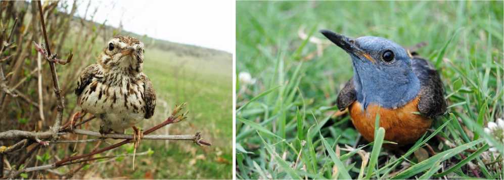 Рис. 7. Лесной жаворонок Lullula arborea (найден на гнездовании только в горной степи котловин); пёстрый каменный дрозд Monticola saxatilis . Фото автора