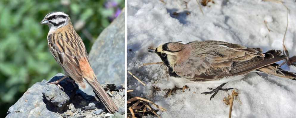 Рис. 8. Характерные птицы зимней авифауны горной степи котловин: горная овсянка Emberiza cia , фото Д.С.Шевцова; рогатый жаворонок Eremophila alpestris , фото автора