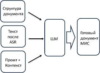 В общем случае LLM должна выступать в роли корректора данных транскрибации, интегратора обработанных речевых и текстовых данных из шаблона, и как формирователь структуры данных (приведение текста к требуемой структуре). Столь широкая постановка функциональной задачи речевого ввода медицинских данных является новой и перспективной.
