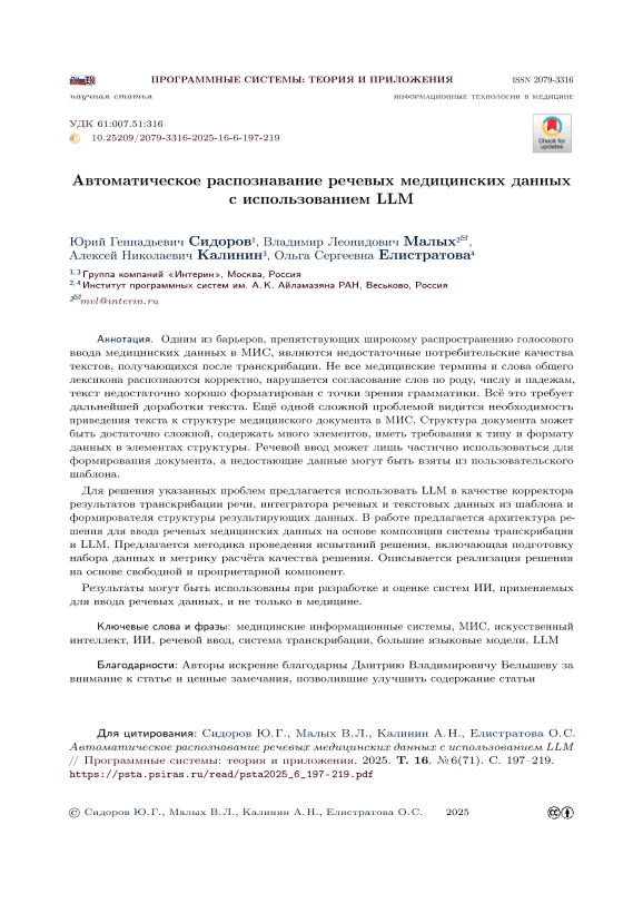 Одним из барьеров, препятствующих широкому распространению голосового ввода медицинских данных в МИС, являются недостаточные потребительские качества текстов, получающихся после транскрибации. Не все медицинские термины и слова общего лексикона распознаются корректно, нарушается согласование слов по роду, числу и падежам, текст недостаточно хорошо форматирован с точки зрения грамматики. Всё это требует дальнейшей доработки текста. Ещё одной сложной проблемой видится необходимость приведения текста к структуре медицинского документа в МИС. Структура документа может быть достаточно сложной, содержать много элементов, иметь требования к типу и формату данных в элементах структуры. Речевой ввод может лишь частично использоваться для формирования документа, а недостающие данные могут быть взяты из пользовательского шаблона. Для решения указанных проблем предлагается использовать LLM в качестве корректора результатов транскрибации речи, интегратора речевых и текстовых данных из шаблона и формирователя структуры результирующих данных. В работе предлагается архитектура решения для ввода речевых медицинских данных на основе композиции системы транскрибации и LLM. Предлагается методика проведения испытаний решения, включающая подготовку набора данных и метрику расчёта качества решения. Описывается реализация решения на основе свободной и проприетарной компонент. Результаты могут быть использованы при разработке и оценке систем ИИ, применяемых для ввода речевых данных, и не только в медицине.