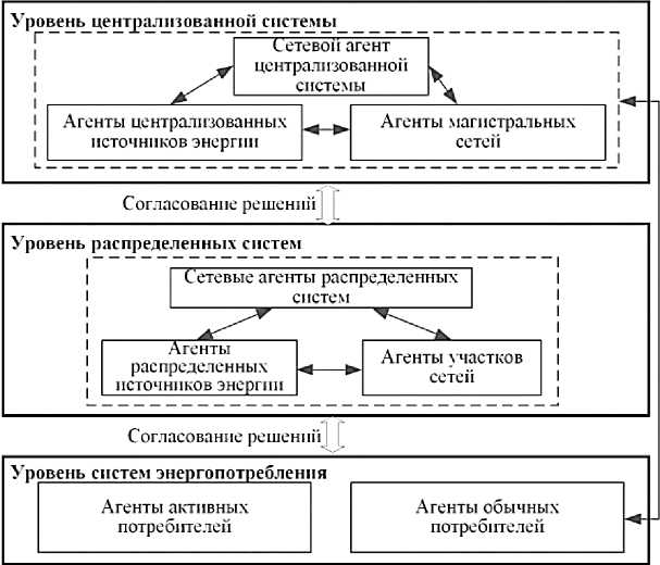 Структура МАС, отражающая особенности построения ИЭС, описывается тремя уровнями (рисунок 2) [6]: уровень централизованной системы; уровень распределённых систем; уровень систем энергопотребления. МАС является неоднородной, и при её построении используются агенты следующих типов: