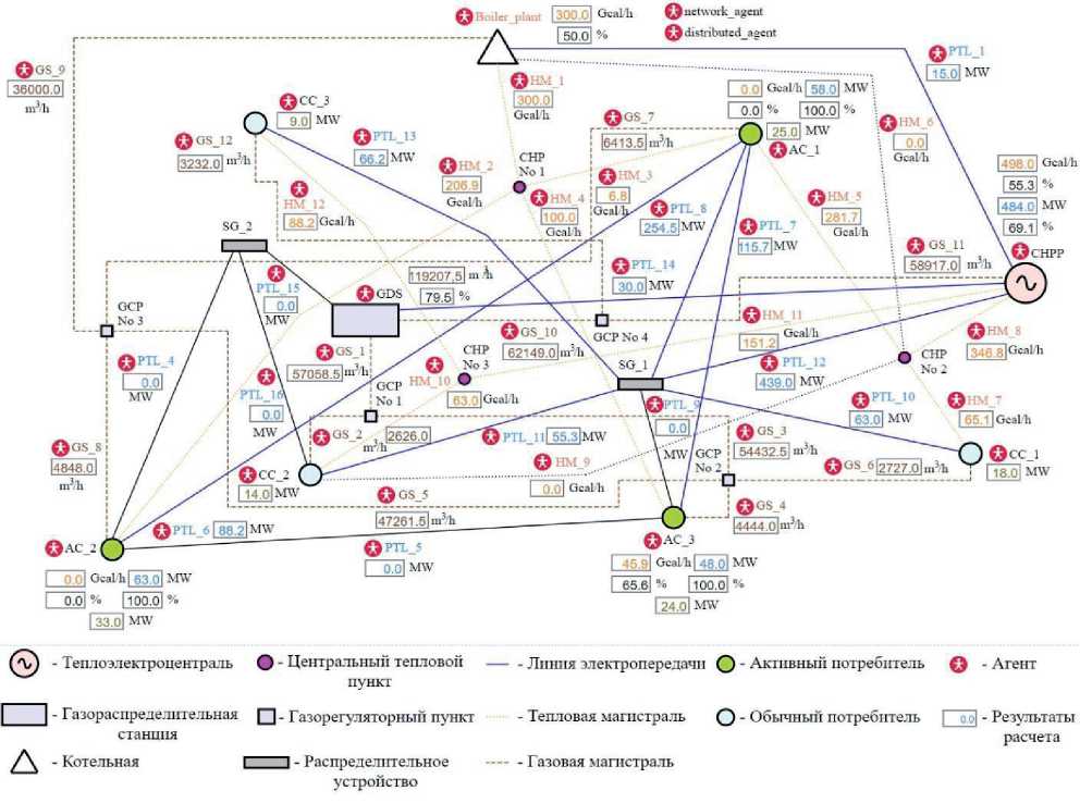 Общее количество агентов 49, из них: 3 агента обычных потребителей; 3 агента активных потребителей; 3 агента централизованных источников энергии; 38 агентов участков сетей, включая 14 линий электропередачи, 12 тепловых магистралей и 12 газовых магистралей; 1 сетевой агент распределённой системы; 1 сетевой агент централизованной системы.