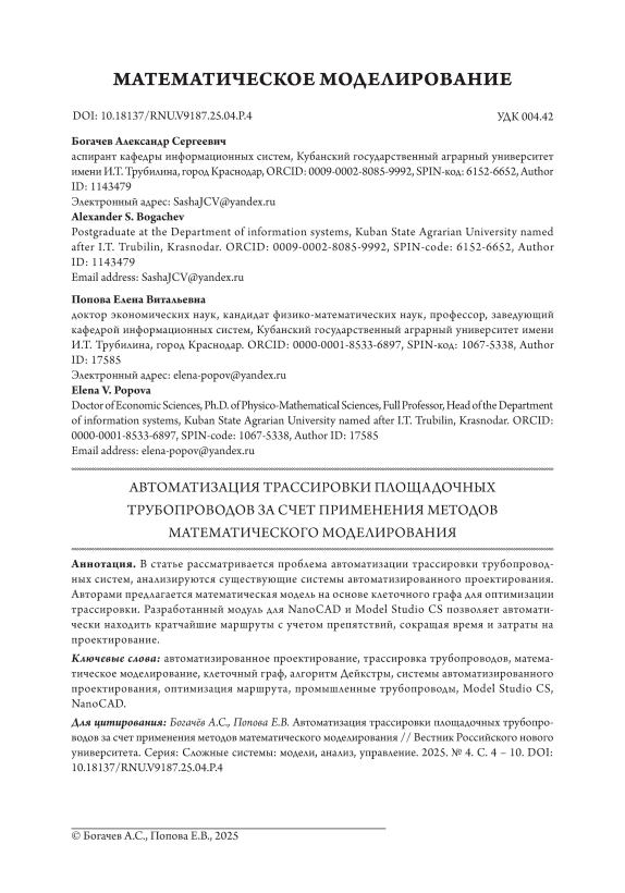 Автоматизированное проектирование, трассировка трубопроводов, математическое моделирование, клеточный граф, алгоритм Дейкстры, системы автоматизированного проектирования, оптимизация маршрута, промышленные трубопроводы, Model Studio CS, NanoCAD