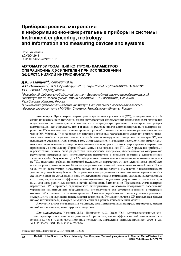 При контроле параметров операционных усилителей (ОУ), подвергаемых воздействию ионизирующего излучения, может потребоваться использование нескольких схем включения и достаточно длительная (до десятков часов) регистрация критериальных параметров, что требует автоматизации всего процесса. Цели и задачи: решение задачи автоматизированного контроля параметров ОУ в течение длительного времени при необходимости использования разных схем включения ОУ. Методы. До и во время воздействия с помощью разработанной методики контролировались такие наиболее чувствительные к воздействию ионизирующего излучения параметры ОУ, как напряжение смещения нуля, входной ток, быстродействие. Управление переключением измерительных схем, подключение и контроль напряжения питания, регистрация контролируемых параметров проводились с помощью приборов, объединенных под управлением ПK. Для управления приборами и регистрации данных была разработана интерфейсная программа, обеспечивающая отображение результатов измерения всех контролируемых параметров в реальном времени с одновременной записью в файл. Результаты. Для ОУ, облучаемого гамма-квантами изотопного источника на основе 60Со, получены графики зависимостей исследуемых параметров от накопленной дозы при общем времени регистрации порядка 70 часов для различных значений интенсивности воздействия. Показано, что из исследуемых параметров только входной ток заметно изменяется в рассматриваемом диапазоне уровней воздействия. Экспериментальные результаты проанализированы в рамках наиболее популярной на сегодняшний день конверсионной модели встраивания заряда на поверхностные состояния, определены коэффициенты аппроксимации полученных результатов модельными кривыми для двух различных интенсивностей набора дозы. Заключение. Предложена схема контроля параметров ОУ в процессе радиационного эксперимента, разработано программное обеспечение управления измерительным оборудованием, используемого для автоматизированной регистрации отклика ОУ в течение длительного времени. Проведена апробация методики в условиях реального эксперимента при вариации интенсивности воздействия. Установлено, что в ОУ проявляется эффект низкой интенсивности, который не удается описать в рамках конверсионной модели.
