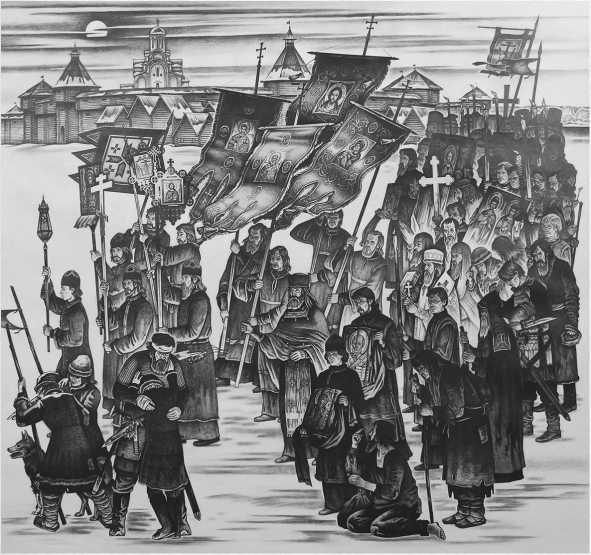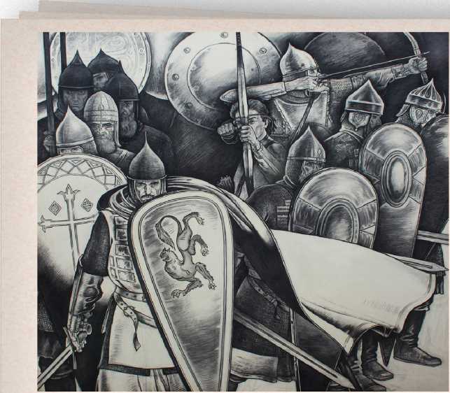 Впоследствии дипломный эскиз был переработан и перерос в монументальную трехчастную графическую композицию «Победа. Не в силе Бог, но в правде. Псков. 1242 год. 5 апреля» (2004) (рис. 10). Очевидно, что образ стоящего в правой части триптиха за митрополитом Псковским воина со склоненной головой – это автопортрет художника: мыузнаем его лицо, прическу, фигуру. Почему А. И. Кияйкин решил «отдать» свою внеш- ность данным персонажам, неизвестно. Однако, зная гражданскую позицию художника,