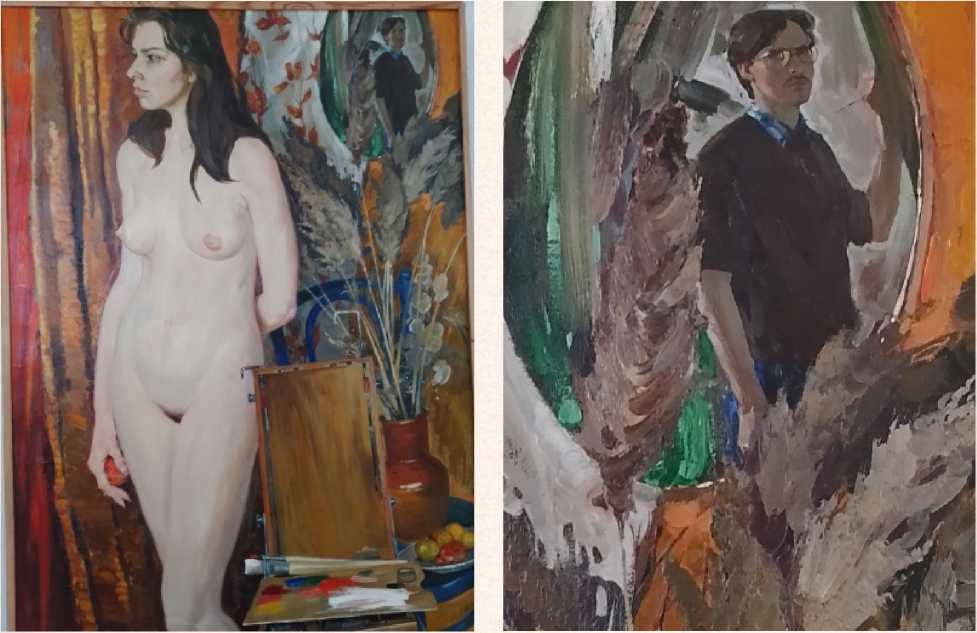 Продолжением темы «Художник в мастерской» в раннем творчестве А. И. Кияйкина стала интерпретация еще одной глубоко разрабатываемой в европейском и отечественном изобразительном искусстве темы – «Художник и модель» (рис. 7). В 1992 г. он написал картину с одноименным названием, в которой на первом плане представил поколенное изображение обнаженной натурщицы. Ее прекрасное молодое тело светится на фоне «полыхающей» оранжевой драпировки. Почти соприкасаясь с моделью, слева и чуть впереди нее стоит раскрытый этюдник с рабочей палитрой, красками, кистями и мастихином. Позади этюдника стоит синий венский стул с собранным на нем натюрмортом – параллельная работа художника. В верхнем правом углу композиционный круг замыкается небольшим овальным зеркалом, висящим на стене. В нем видно отражение работающего над картиной художника – его автопортрет. Он изобразил себя стоящим за мольбертом и увлеченно погруженным в работу. Его взгляд впервые спрятан за стеклами очков, что позволяет мастеру отстраниться от буквального толкования сюжета и раскрыть его возможную символику. Очевидна полижанровость картины. Автор объединяет изображение ню с натюрмортами, размещая «атрибуты искусства» на первом плане, делая их столь же важными персонажами