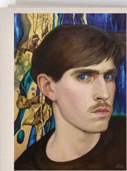 Последний живописный автопортрет А. И. Кияйкина (1993) наиболее известен. Художник назвал его просто – «Автопортрет на синем», создав на небольшом по размерам холсте самый во всех смыслах полнозвучный и проникновенный образ человека-творца – как он его тогда понимал (рис. 8). Возникновение замысла данного автопортрета знаково совпадает с ключевым этапом в биографии мастера – последним годом обучения в Суриковском институте и вступлением в Союз художников России. Этот период маркирует окончательное профессиональное и личностное самоопределение художника, кристаллизацию его внутренней позиции и осознание своего творческого предназначения. В работе художник избирает себя в качестве модели. Он словно любуется красотой своего лица, подчеркивая синеву глаз и яркость губ, «укладывая» вокруг лица каштановые пряди волос, оттеняющие свежесть и румяность кожи. Эффектна экспрессивная композиция автопортрета – плечи развернуты по диагонали, изображение головы дано в резком трехчетвертном повороте вправо. Особое внимание живописец уделил фону. Мажорно звучит сложный аккорд холодных