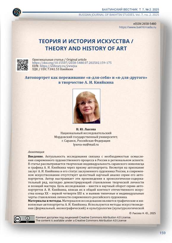 Введение. Актуальность исследования связана с необходимостью осмысления современного художественного процесса в России в региональном аспекте. В статье рассматривается творческая индивидуальность саранского живописца и графика А. И. Кияйкина через призму автопортрета. Несмотря на признание заслуг А. И. Кияйкина и его статус заслуженного художника России, в современном искусствознании отсутствует целостный научный анализ серии его автопортретов. Автор выстраивает эти произведения в хронологически-содержательный ряд, наглядно демонстрирующий становление творческой личности и позиций мастера. Цель исследования – ввести в научный оборот серию автопортретов А. И. Кияйкина, вписав их в общий контекст отечественного искусства конца XX – первой четверти XXI в. и выявив типичные и индивидуальные черты становления личности современного российского художника. Материалы и методы. Материалом исследования являются графические и живописные автопортреты А. И. Кияйкина. Используются методы искусствоведения (формальный, иконографический) и культурологии (культурологической герменевтики). Исследование вписано в рамки концептуального осмысления феномена автопортрета, предложенного М. М. Бахтиным в понятийных категориях от «я-для-себя» до «я-для-другого». Результаты исследования и их обсуждение. Автопортрет (образ художника, созданный им самим) – один из самых сложных и глубоких жанров в изобразительном искусстве. Погружение в его пространство (самого художника и зрителя, воспринимающего произведение) зависит от многих факторов, связанных с пониманием или разгадыванием смыслов, манифестируемых автором. Художники обращаются к жанру автопортрета, чтобы определить свое место в культуре. На разных этапах жизни они видят себя по-разному, меняющийся мир меняет и их мировоззрение. Мастер погружается в свои внутренние переживания, задумывается о своем предназначении, о природе собственного творчества, пытаясь найти в нем оптимально приемлемое соотношение субъективного и объективного. Автопортреты не занимают центрального места в творчестве А. И. Кияйкина, однако они помогают понять художника, его внутренние творческие установки и позиции, открыть особый строй его искусства. Анализируя автопортреты А. И. Кияйкина, автор делает вывод, что они логично вписываются в целостный ряд самоизображений представителей разных периодов развития отечественного искусства. Заключение. Статья вводит в научный оборот значительную серию ранее неизвестных графических и живописных автопортретов А. И. Кияйкина. Эти произведения не только представляют собой важные факты его творческой биографии, но и раскрывают его гражданские позиции, помогают глубже осознать его творческий и человеческий потенциал. Сделанные автором выводы вносят вклад в изучение современного изобразительного искусства Мордовии и России в целом, в исследование автопортрета как жанра изобразительного искусства. Материалы статьи могут быть полезны искусствоведам, культурологам как при рассмотрении творчества А. И. Кияйкина, так и в процессе осмысления современного этапа развития отечественной художественной культуры.