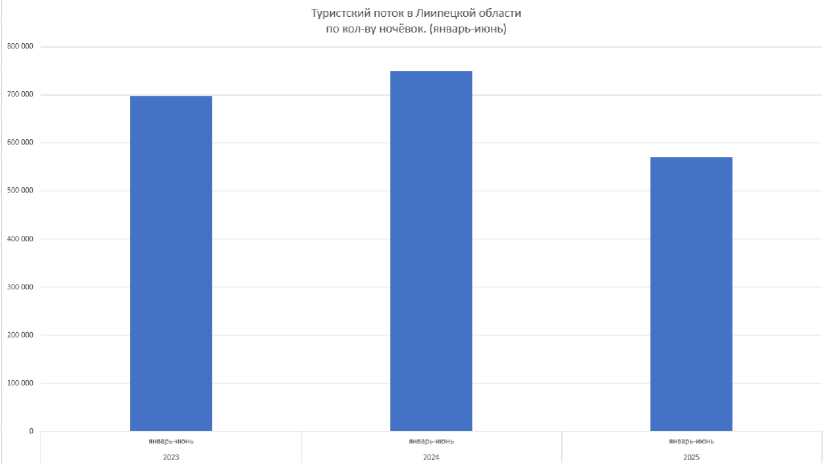 В турпотоке (по количеству ночёвок) Липецкой области, согласно данным Росстата7, за период январь – июнь (рисунок 1), наблюдается нестабильность в динамике. После роста в 2024 году в 750 234 (рост на 7,5% по сравнению с 2023 годом-698 022) произошёл существенный спад в 2025 году – 571 046 (снижение на 23,9% по сравнению с 2024 годом и на 18,1% по сравнению с 2023 годом.), что требует анализа причин и корректировки мер по поддержке туризма.