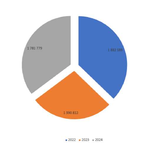 Динамика годового потока (2022-2024 годы, рисунок 2) носит волнообразный характер. После пика в 2022 году – 1882 189 ночевок произошёл спад в 2023 году до 1 390 812 ночевок (снижение на 26,1%), за которым последовало восстановление в размере 1 781 779 ночевок в 2024 году (рост на 27,4). Это может свидетельствовать о цикличности факторов, влияющих на туристический поток.