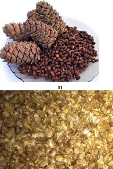 Сурет 1. Сібір балқарағайы : а) Балқарағай жаңғағы б) Қабық в) Дән айналасындағы қабықша г) Дән